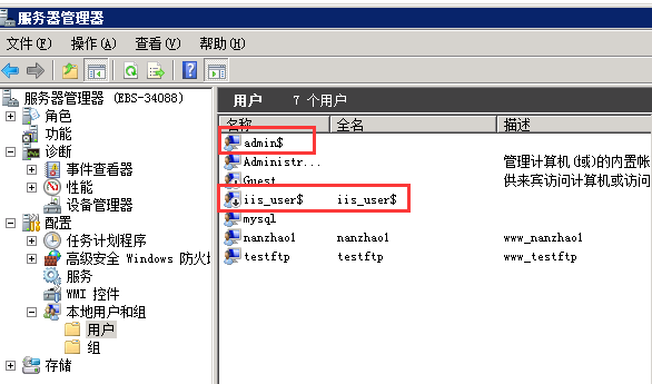 在计算机管理中,查看本地用户和组。如果出现不是系统管理员添加的用户,说明服务器很有可能被入侵了。