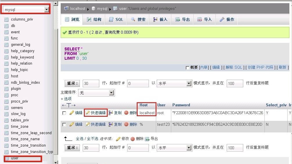 用phpMyAdmin登录MySQL数据库,选择mysql数据库,打开user表,选择您需要开启远程连接的用户,点击“快速编辑”,将host列里面的值修改为%(允许全部IP地址)或者需要远程的IP地址。