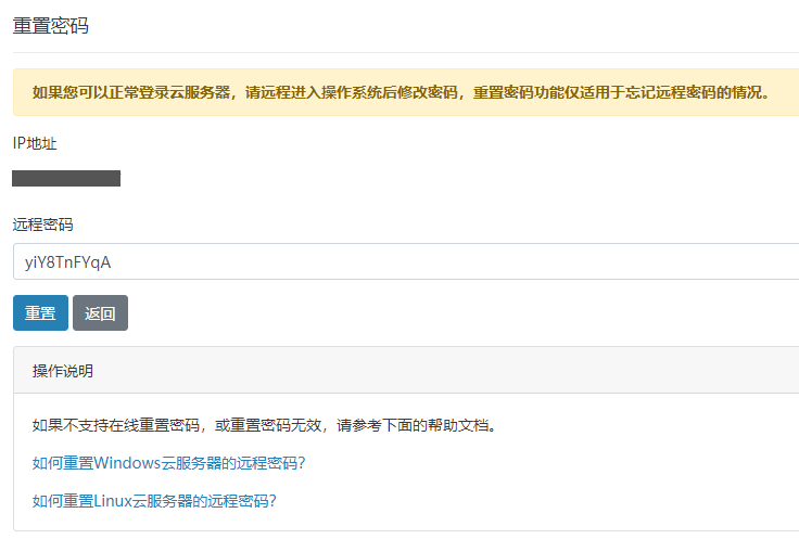 - 该功能适用于忘记远程密码的情况。如果您可以正常登录云服务器,请远程进入操作系统后修改密码。